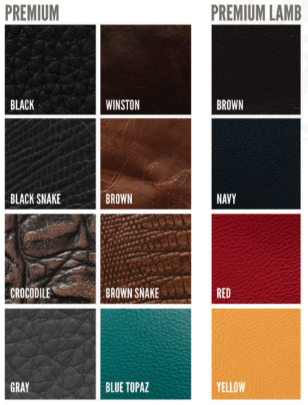 If you’re looking for leather, you can select our Top Grain (7 colors) or Faux (4 colors) leathers at no additional cost. Or, choose Premium (8 colors), Premium Lamb (4 colors), or Premium Calf (5 colors) for an extra $40.