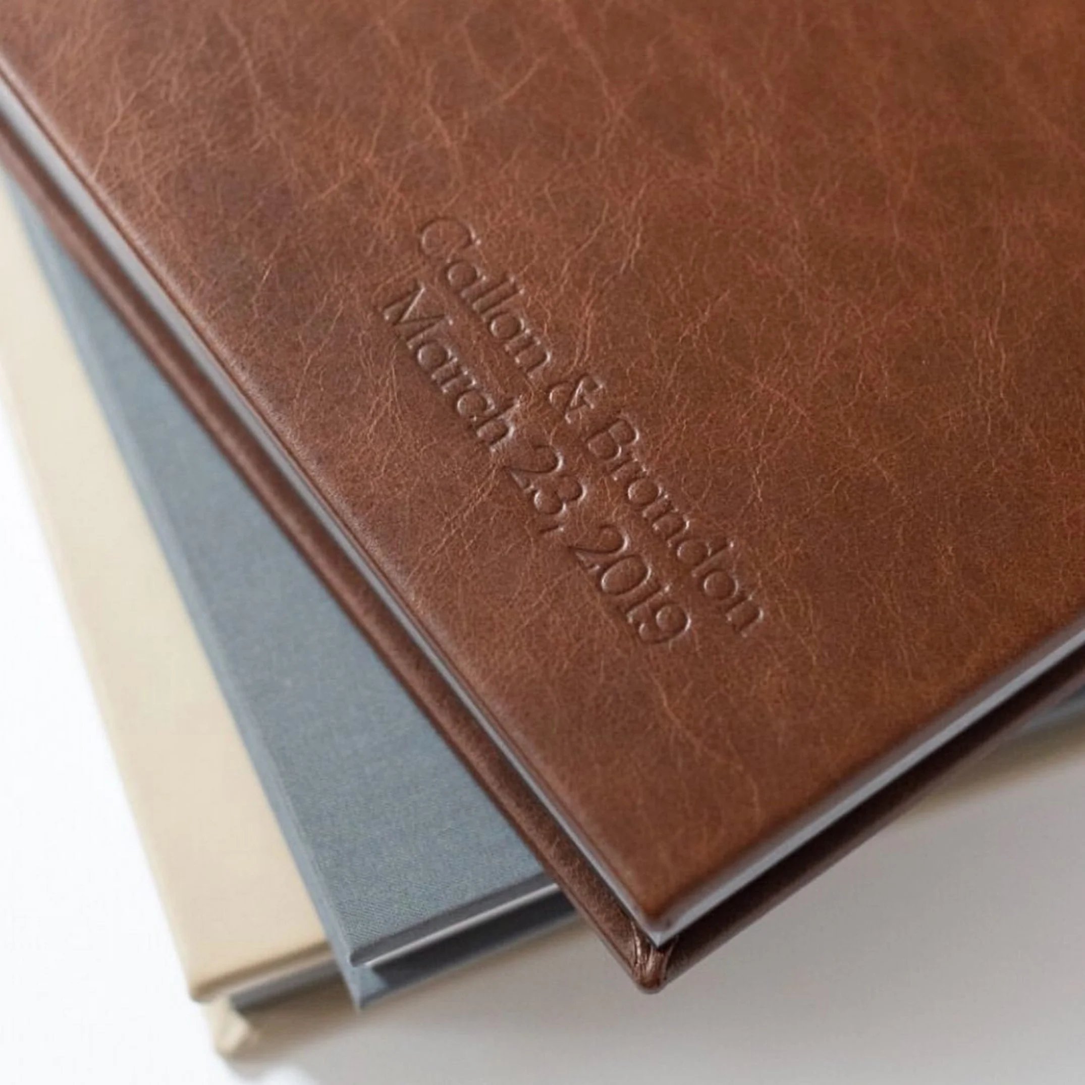 Imprinting is the technique of stamping leather to create imprinted designs and lettering. There’s no ink involved; instead, imprinting impresses your names directly into the leather, creating a relief design that feels engraved to the touch.